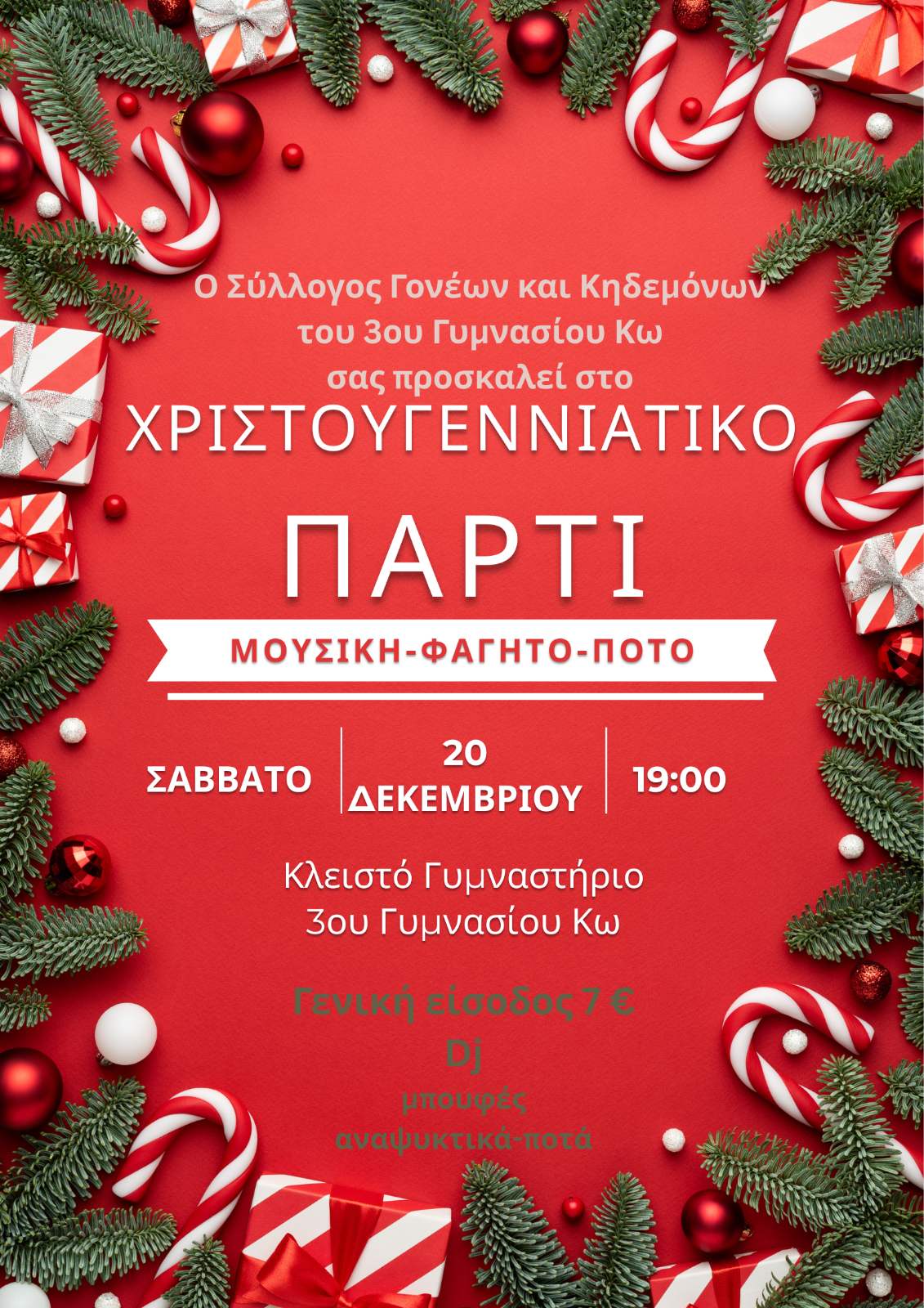 Ο Σύλλογος Γονέων και Κηδεμόνων του 3ου Γυμνασίου Κω προσκαλεί μαθητές, γονείς και φίλους του σχολείου στο Χριστουγεννιάτικο πάρτι που διοργανώνει το Σάββατο 20 Δεκεμβρίου 2025, στο Κλειστό Γυμναστήριο του 3ου Γυμνασίου Κω, από 19:00 έως 22:00.