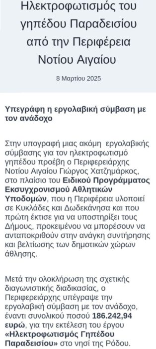 Με αυτόν τον τρόπο άλλωστε, η Περιφέρεια Νοτίου Αιγαίου χρηματοδότησε, εφέτος, έργα στα δημοτικά γήπεδα ποδοσφαίρου, όπως της Απολακκιάς, του Ασκληπιείου, της Λάρδου και του Παραδεισίου, συνολικού προϋπολογισμού 2.056.029,07€.