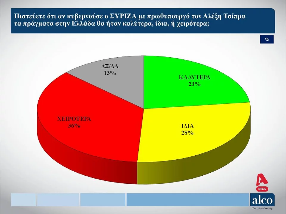 Το 36% πιστεύει ότι τα πράγματα στην Ελλάδα θα ήταν χειρότερα με κυβέρνηση ΣΥΡΙΖΑ και πρωθυπουργό τον Αλέξη Τσίπρα, έναντι 23% που θεωρεί ότι θα ήταν καλύτερα και 28% που απαντά ότι θα ήταν ίδια.