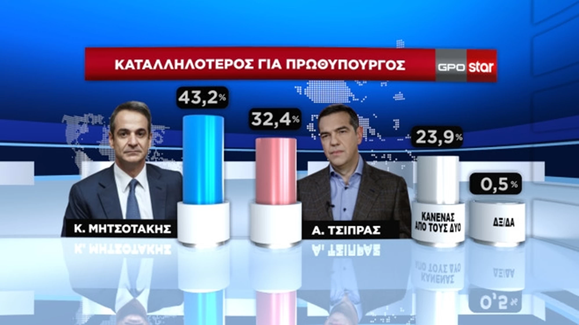 Το 43,2% θεωρεί καταλληλότερο πρωθυπουργό τον Κυριάκο Μητσοτάκη, έναντι 32,4% που θεωρεί καταλληλότερο τον Αλέξη Τσίπρα.