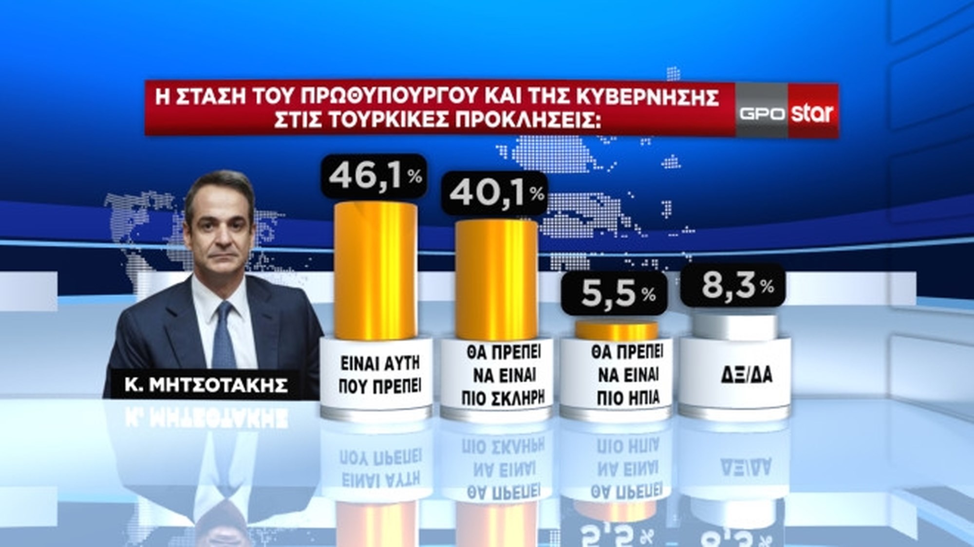 Tο 46,1% θεωρεί ότι η στάση του πρωθυπουργού απέναντι στις τουρκικές προκλήσεις είναι αυτή που πρέπει.