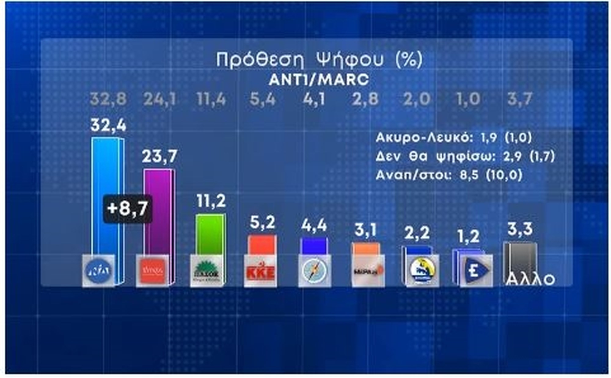 Στις 8,7 μονάδες καταγράφεται η διαφορά μεταξύ Νέας Δημοκρατίας και ΣΥΡΙΖΑ σύμφωνα με το δεύτερο μέρος της δημοσκόπησης της εταιρείας Marc για τον ΑΝΤ1.