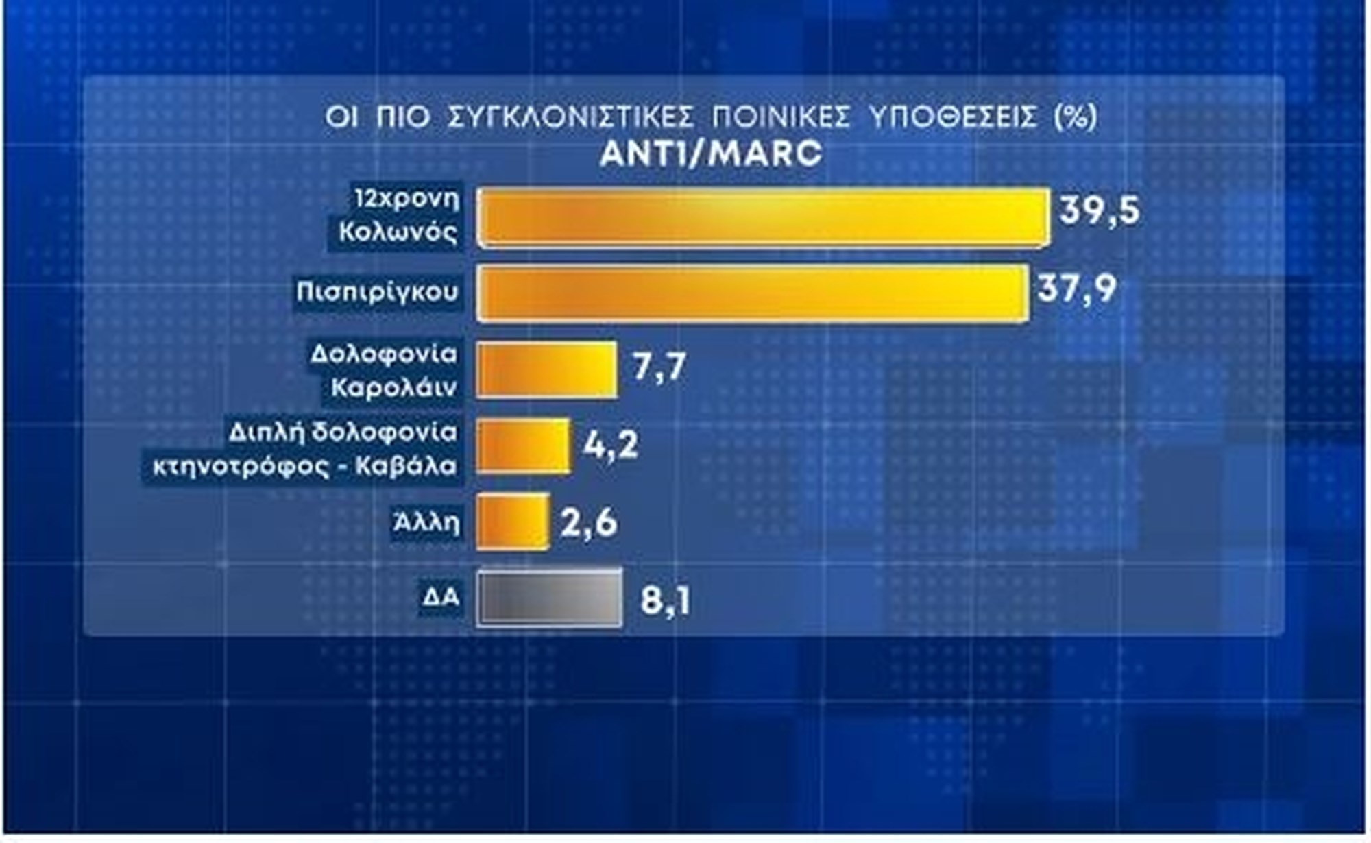 Το 39,5% των πολιτών που ερωτήθηκαν λένε ότι η υπόθεση με τον βιασμό και η εκπόρνευση της 12χρονης στον Κολωνό είναι αυτή που τους έχει συγκλονίσει περισσότερο και το 37,9% την υπόθεση της Ρούλας Πισπιρίγκου.