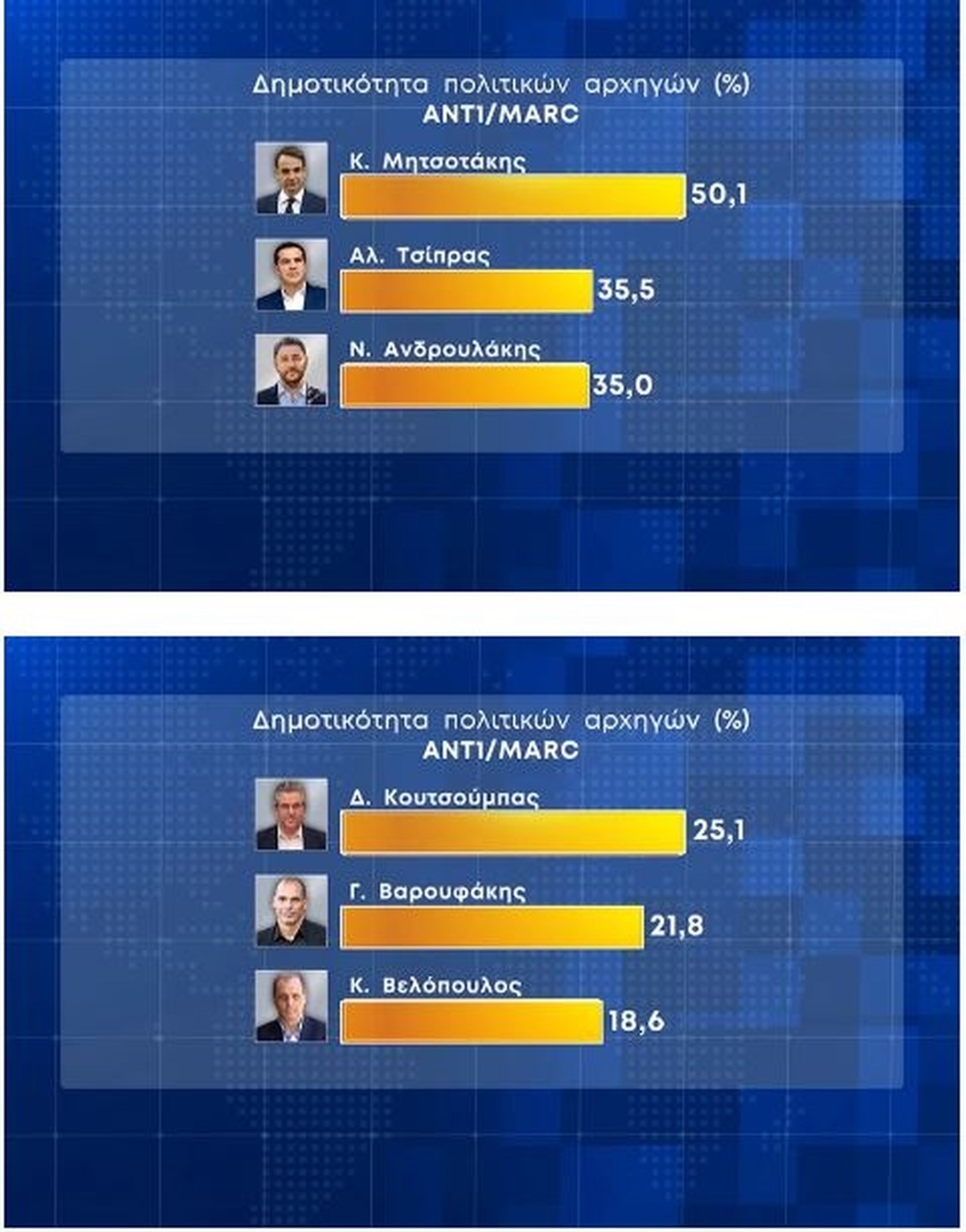 Στη δημοτικότητα των πολιτικών αρχηγών τα ποσοστά έχουν ως εξής: