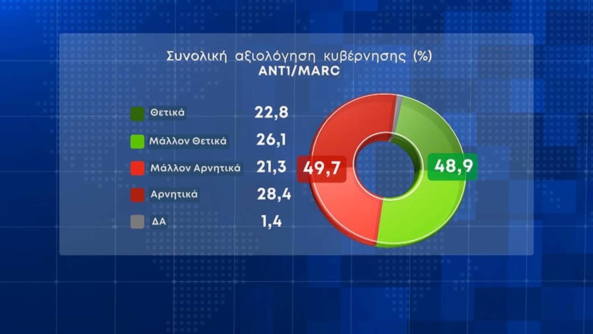 Στο ερώτημα για την συνολική αξιολόγηση της κυβέρνησης το 22,8% την αποτιμά θετικά, το 26,1% μάλλον θετικά, το 21,3% μάλλον αρνητικά και το 28,4% αρνητικά.