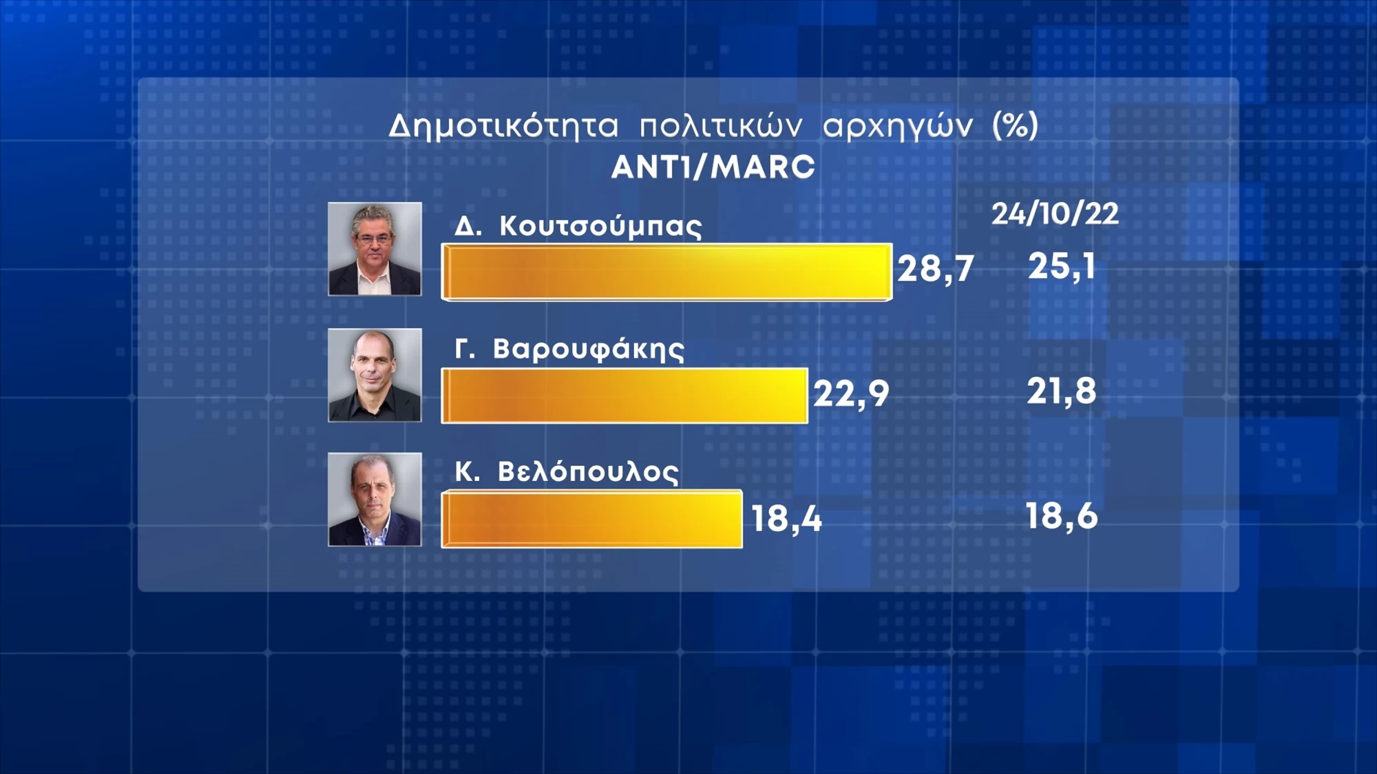 Στη δημοτικότητα των πολιτικών αρχηγών ο Κυριάκος Μητσοτάκης διατηρεί μεγάλο προβάδισμα έναντι του αρχηγού της αξιωματικής αντιπολίτευσης. Συγκεκριμένα ο πρωθυπουργός συγκεντρώνει 47,8%, ο Νίκος Ανδρουλάκης 34,3% και ακολουθεί ο Αλέξης Τσίπρας 33,7%.