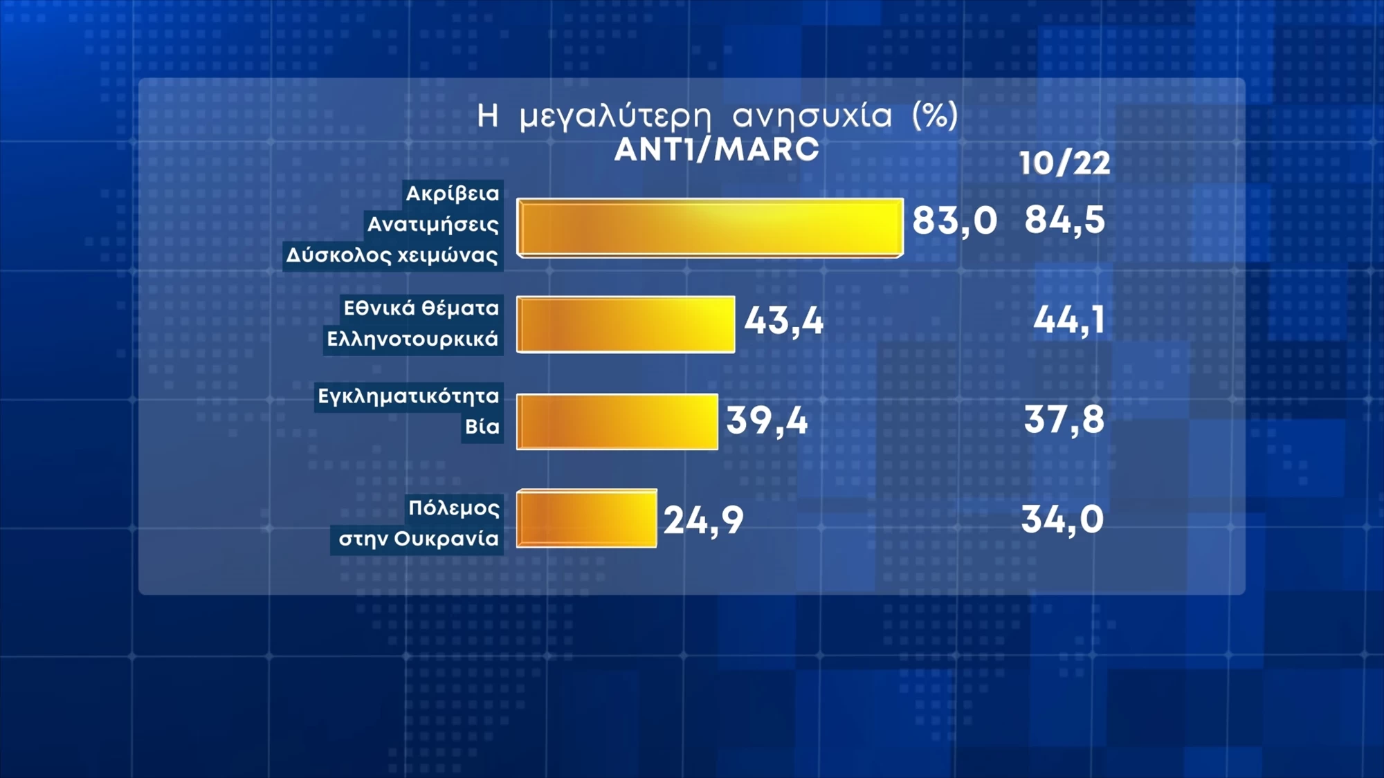 Μεγάλη ανησυχία έχουν οι πολίτες για την ακρίβεια και τις ανατιμήσεις προϊόντων, με το 83% να το θέτει μεγαλύτερο ζήτημα.