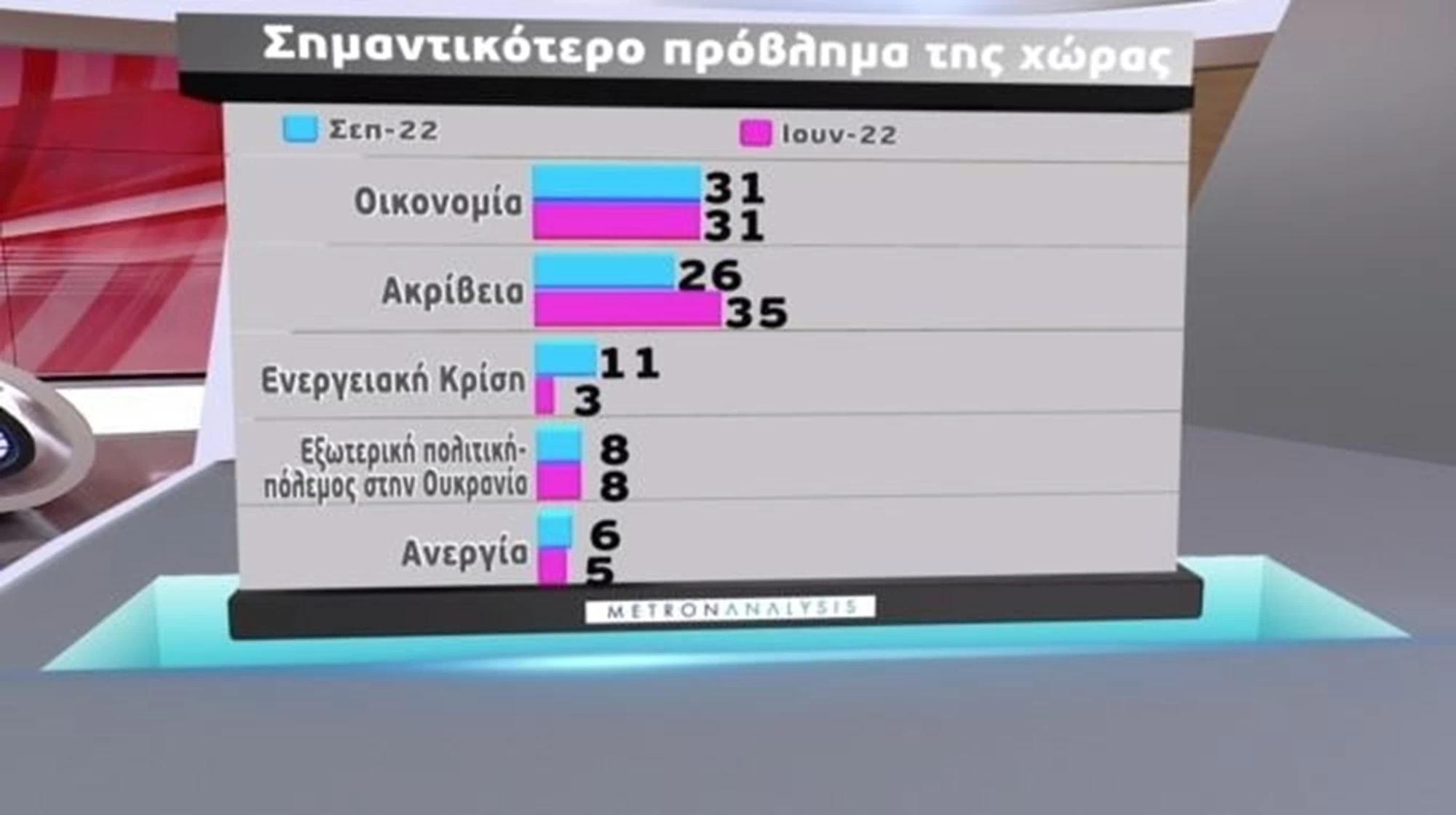 Την ίδια ώρα, οι συμμετέχοντες ιεράρχησαν και το σημαντικότερο πρόβλημα της χώρας, με το 31% να υποστηρίζει πως είναι η οικονομία, το 26% η ακρίβεια, το 11% η ενεργειακή κρίση και το 8% την εξωτερική πολιτική και τον πόλεμο στην Ουκρανία.