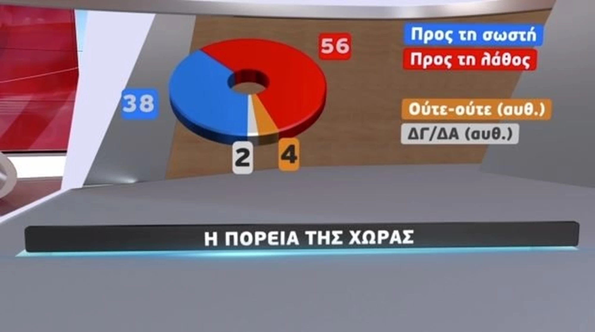 Η πλειοψηφία των πολιτών που συμμετείχαν στη δημοσκόπηση εκτίμησε ότι η πορεία της χώρας είναι προς τη λάθος κατεύθυνση, ενώ ένα 38% υποστήριξε ότι πάει προς τη σωστή κατεύθυνση.