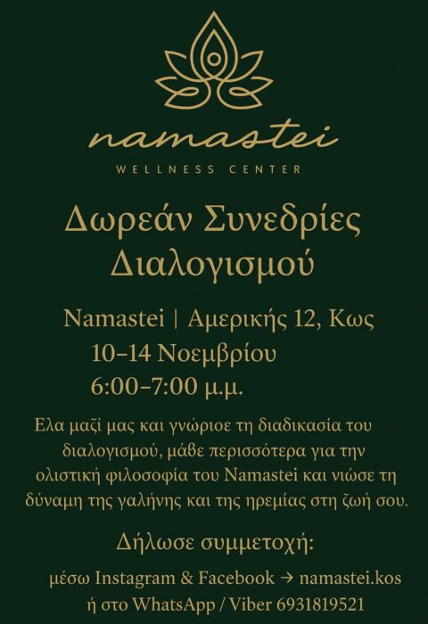 Από τις 10 έως 14 Νοεμβρίου, το Namastei Wellness Center προσκαλεί το κοινό της Κω να γνωρίσει τη δύναμη της γαλήνης μέσα από δωρεάν συνεδρίες διαλογισμού, καθημερινά 6:00 – 7:00 μ.μ., στον φιλόξενο χώρο του κέντρου, Αμερικής 12.
