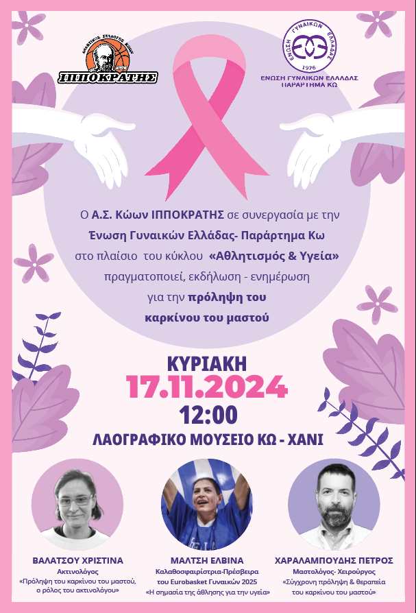 Ο Α.Σ. Κώων Ιπποκράτης στο πλαίσιο του κύκλου «Αθλητισμός και Υγεία» πραγματοποιεί σε συνεργασία με την Ένωση Γυναικών Ελλάδας- Παράρτημα Κω, εκδήλωση- ενημέρωση για την πρόληψη του καρκίνου του μαστού την Κυριακή 17 Νοεμβρίου και ώρα 11.30 π.μ. στην αίθουσα του Λαογραφικού Μουσείου (Χάνι).