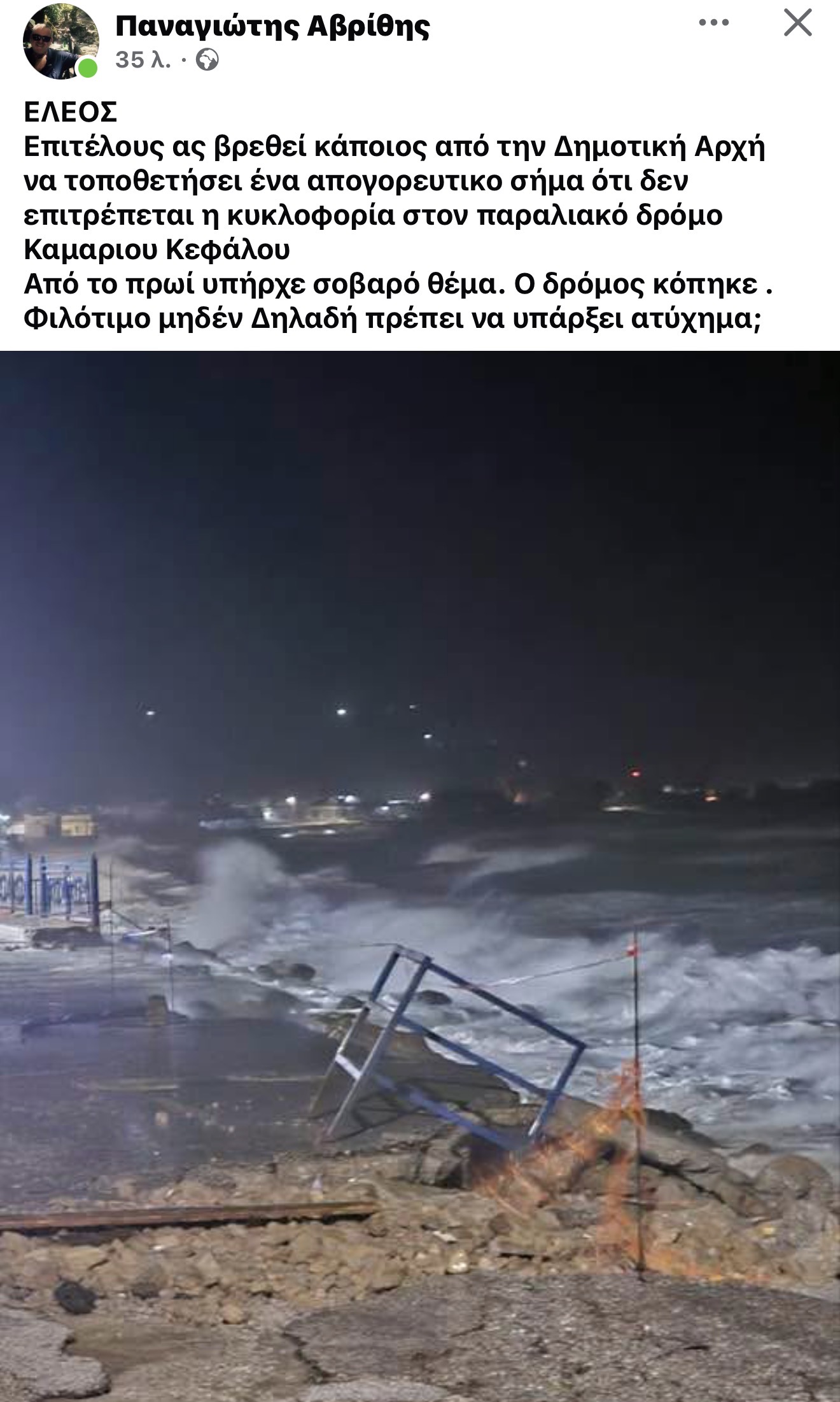 Σε μια οργισμένη παρέμβαση προχώρησε μέσω του προσωπικού του λογαριασμού στο Facebook ο Ανεξάρτητος Δημοτικός Σύμβουλος, Παναγιώτης Αβρίθης, αναφορικά με την κατάσταση στον παραλιακό δρόμο Καμαρίου – Κεφάλου.
