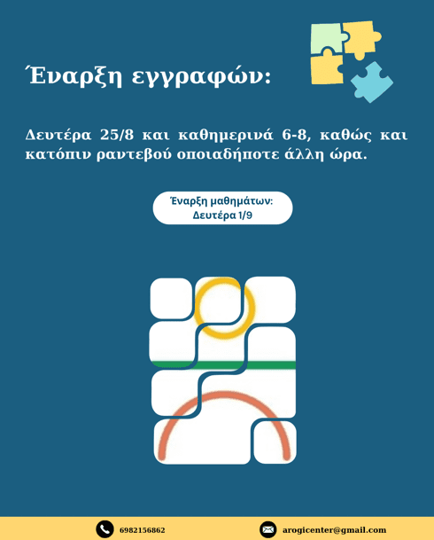 Το Κέντρο Αρωγή ανακοινώνει την έναρξη εγγραφών για τη νέα σχολική χρονιά, από τη Δευτέρα 25 Αυγούστου. Οι εγγραφές θα πραγματοποιούνται καθημερινά 18:00 – 20:00, ενώ υπάρχει δυνατότητα συνεννόησης για ραντεβού σε οποιαδήποτε άλλη ώρα, στο τηλέφωνο 6982156862.