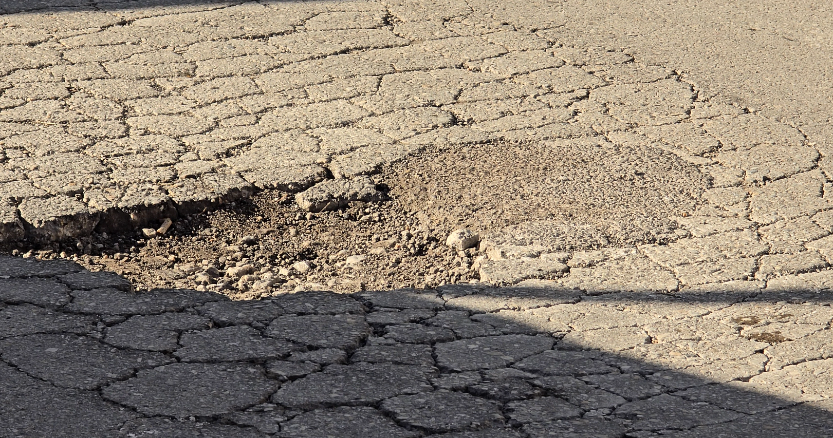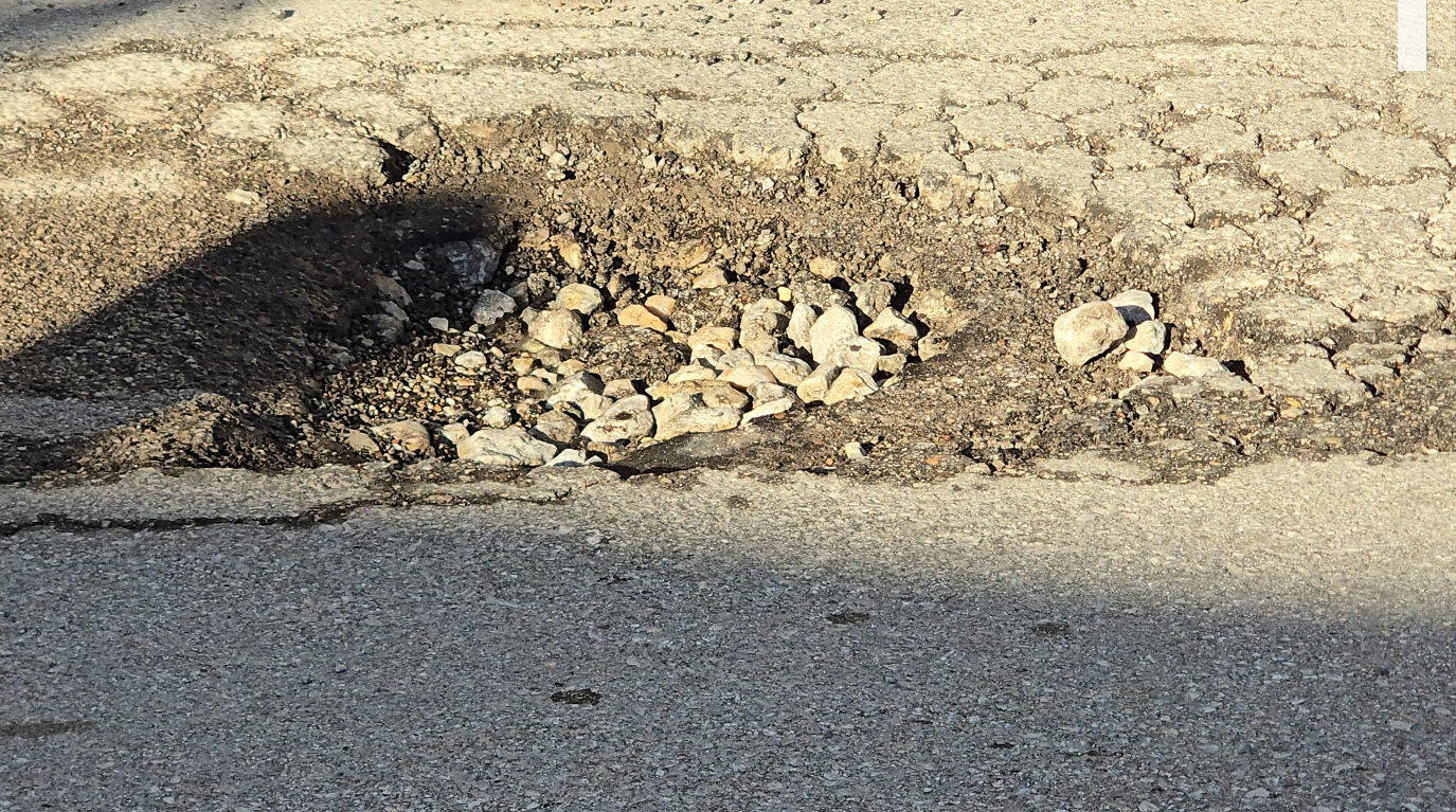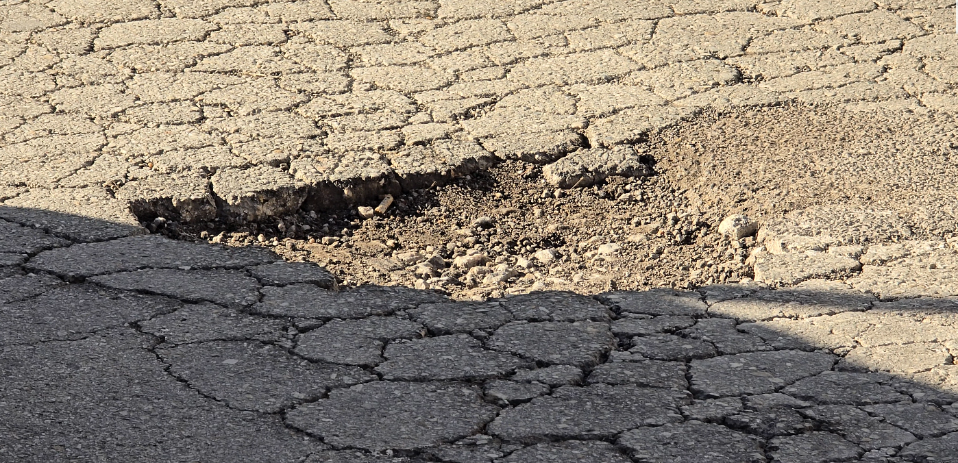 Η κατάσταση επιδεινώθηκε μετά το πέρασμα της κακοκαιρίας Byron, με αποτέλεσμα σήμερα, ύστερα και από τις επανειλημμένες διαμαρτυρίες πολιτών, να μεταβεί στο σημείο συνεργείο για επιτόπιες παρεμβάσεις προσθήκης ασφαλτικού υλικού, ώστε να κλείσουν προσωρινά τα επικίνδυνα ανοίγματα.