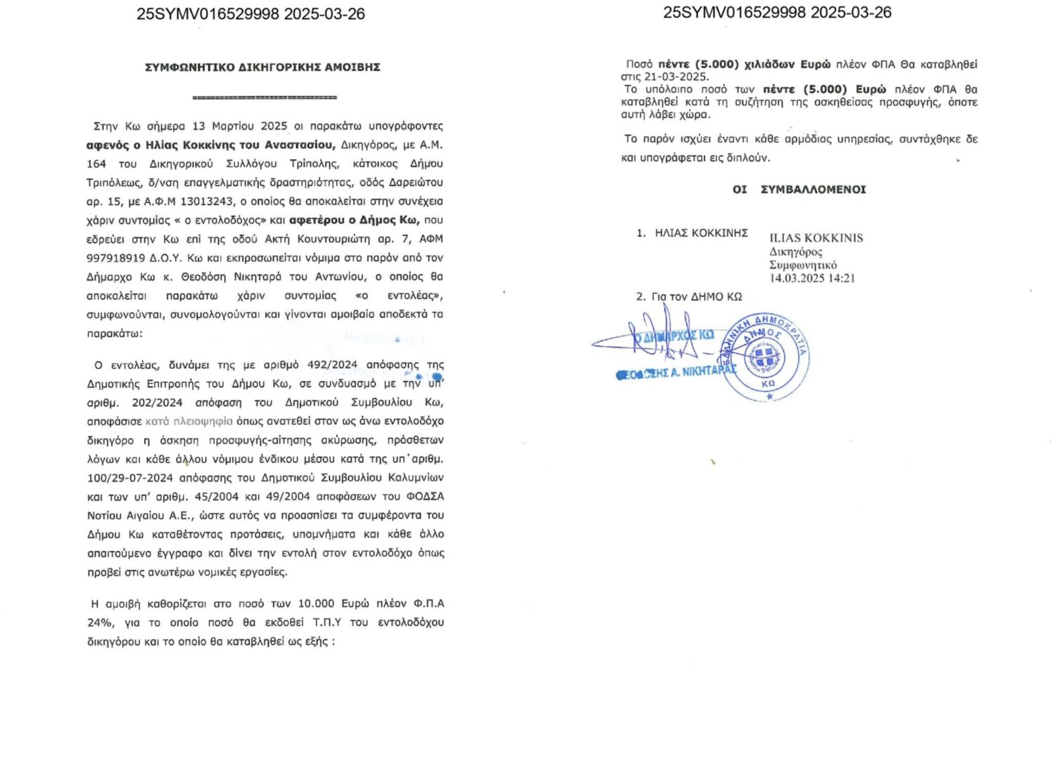 Ο κ. Εκατομμάτης επεσήμανε αρχικά την ανακολουθία ανάμεσα στο ποσό των 6.000 ευρώ που είχε αναφέρει ο Δήμαρχος Κω εντός Δημοτικού Συμβουλίου και στο ποσό που τελικά εμφανίζεται στο συμφωνητικό με τον δικηγόρο, το οποίο ανέρχεται στις 10.000 ευρώ πλέον ΦΠΑ – δηλαδή 12.400 ευρώ μικτά. Όπως τόνισε, «αυτές είναι αμοιβές καθηγητή Πανεπιστημίου» και όχι ενός απλού δικηγόρου, ιδίως όταν πρόκειται για απευθείας ανάθεση.