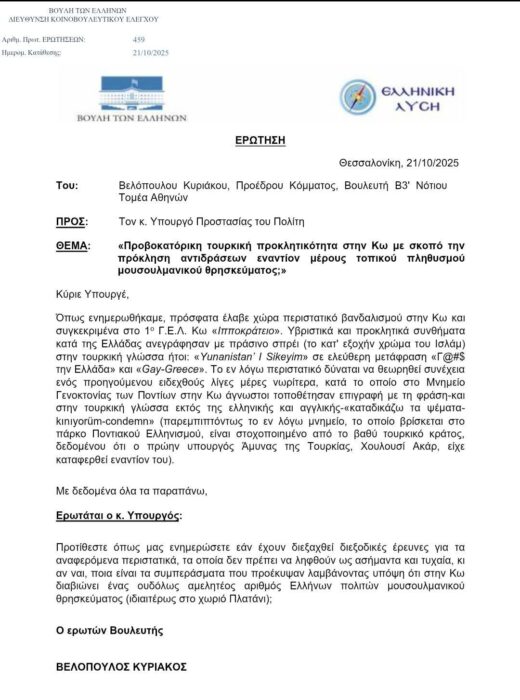 Ερώτηση προς τον Υπουργό Προστασίας του Πολίτη κατέθεσε στη Βουλή ο πρόεδρος της Ελληνικής Λύσης, Κυριάκος Βελόπουλος, καταγγέλλοντας «προβοκατόρικη τουρκική προκλητικότητα» στην Κω, με σκοπό – όπως σημειώνει – την πρόκληση αντιδράσεων εις βάρος του μουσουλμανικού πληθυσμού του νησιού.