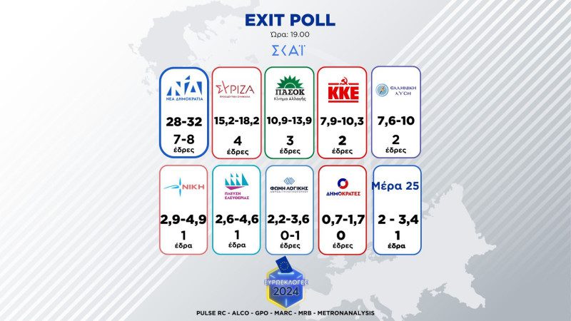 Η ΝΔ αναδεικνύεται πρώτο κόμμα με υψηλό 32%, ο ΣΥΡΙΖΑ δεύτερος με υψηλό 18,2%, και το ΠΑΣΟΚ τρίτο με υψηλό 13,9% σύμφωνα με τα ευρήματα του exit poll του ΣΚΑΪ για τις ευρωεκλογές 2024.