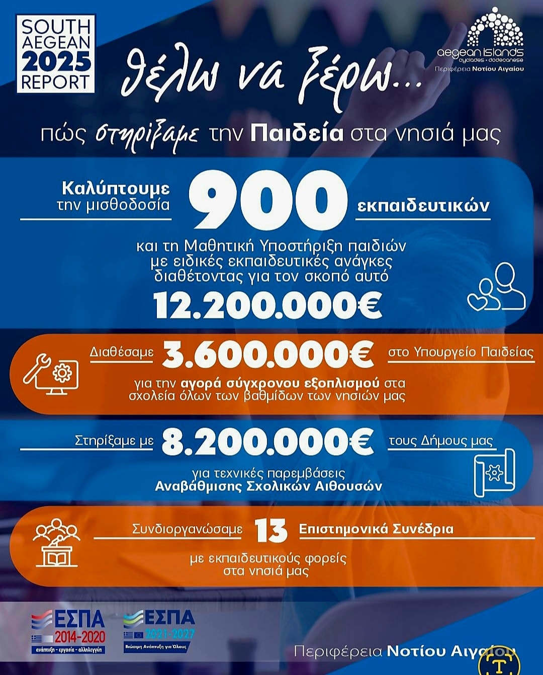Στον απολογισμό των δράσεων της Περιφέρειας Νοτίου Αιγαίου στον τομέα της Παιδείας αναφέρθηκε με ανάρτησή του ο Περιφερειάρχης Γιώργος Χατζημάρκος, δίνοντας έμφαση στη στήριξη της εκπαιδευτικής κοινότητας στα νησιά.