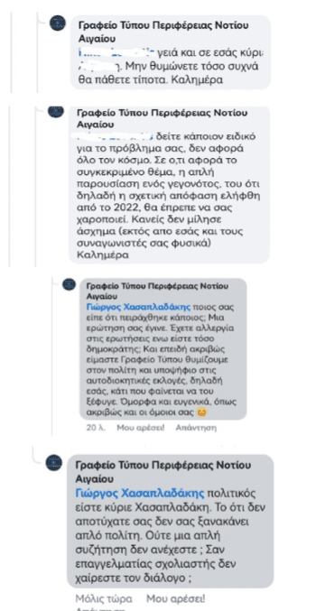 Νοτίου Αιγαίου εμφανίζεται να απαντά σε πολίτες, αιρετούς και μη, με ύφος ειρωνικό,