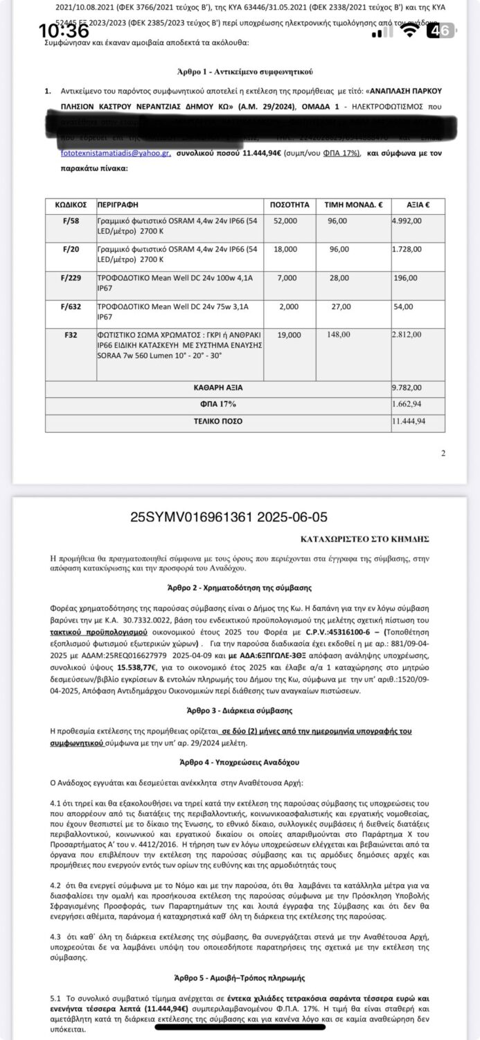 Και δεν σταματάμε εκεί. Άλλη μία απευθείας ανάθεση, ύψους 4.000 ευρώ, δόθηκε σε υποψήφιο και μέλος της παράταξης “Ισχυρή Κως” για την τοποθέτηση καμερών στο ίδιο σημείο, ενισχύοντας το ερώτημα: