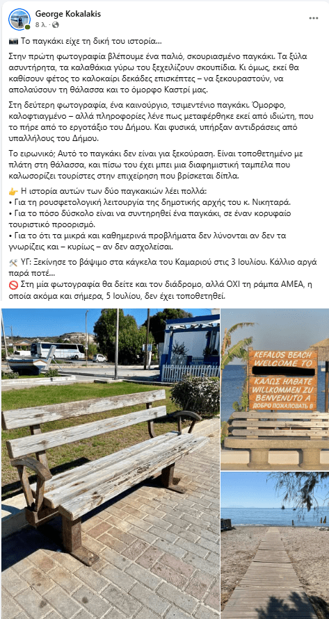 Ο δημοτικός σύμβουλος της “Δύναμης Αλλαγής” κ. Γιώργος Κοκαλάκης, σε ανάρτησή του στον προσωπικό του λογαριασμό στο facebook, παρουσιάζει δύο παγκάκια στο Καστρί, ένα παλιό και ασυντήρητο που παραμένει σε χρήση, και ένα νέο, τσιμεντένιο, που φέρεται να μεταφέρθηκε από ιδιώτη από εργοτάξιο του Δήμου. Επισημαίνει καθυστερήσεις σε εργασίες συντήρησης και την απουσία ράμπας ΑμεΑ έως τις 5 Ιουλίου.
