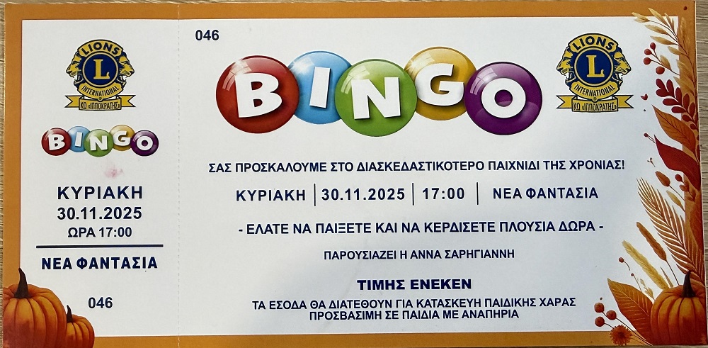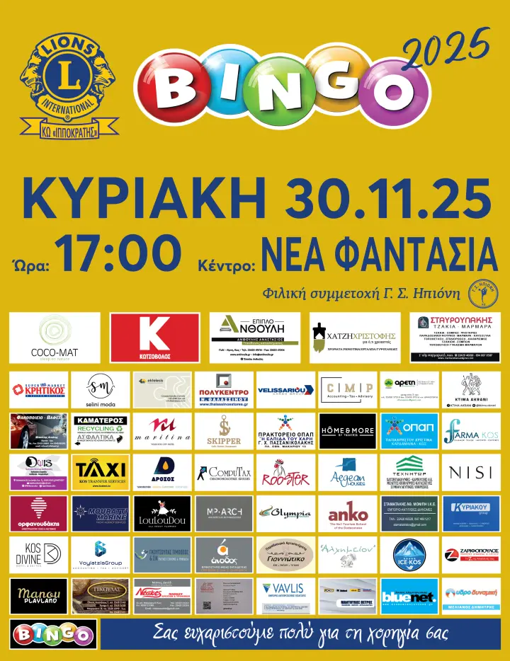 Μια όμορφη και ζεστή εκδήλωση, γεμάτη χαρά, παιχνίδι και προσφορά, διοργανώνει η Λέσχη Lions Club Kos «Ο Ιπποκράτης» την Κυριακή 30 Νοεμβρίου, στις 17:00, στη «ΝΕΑ ΦΑΝΤΑΣΙΑ». Το καθιερωμένο Bingo επιστρέφει και φέτος, προσκαλώντας μικρούς και μεγάλους σε ένα απογευματινό γεμάτο χριστουγεννιάτικη διάθεση, πολλά δώρα και πλούσιο μπουφέ.