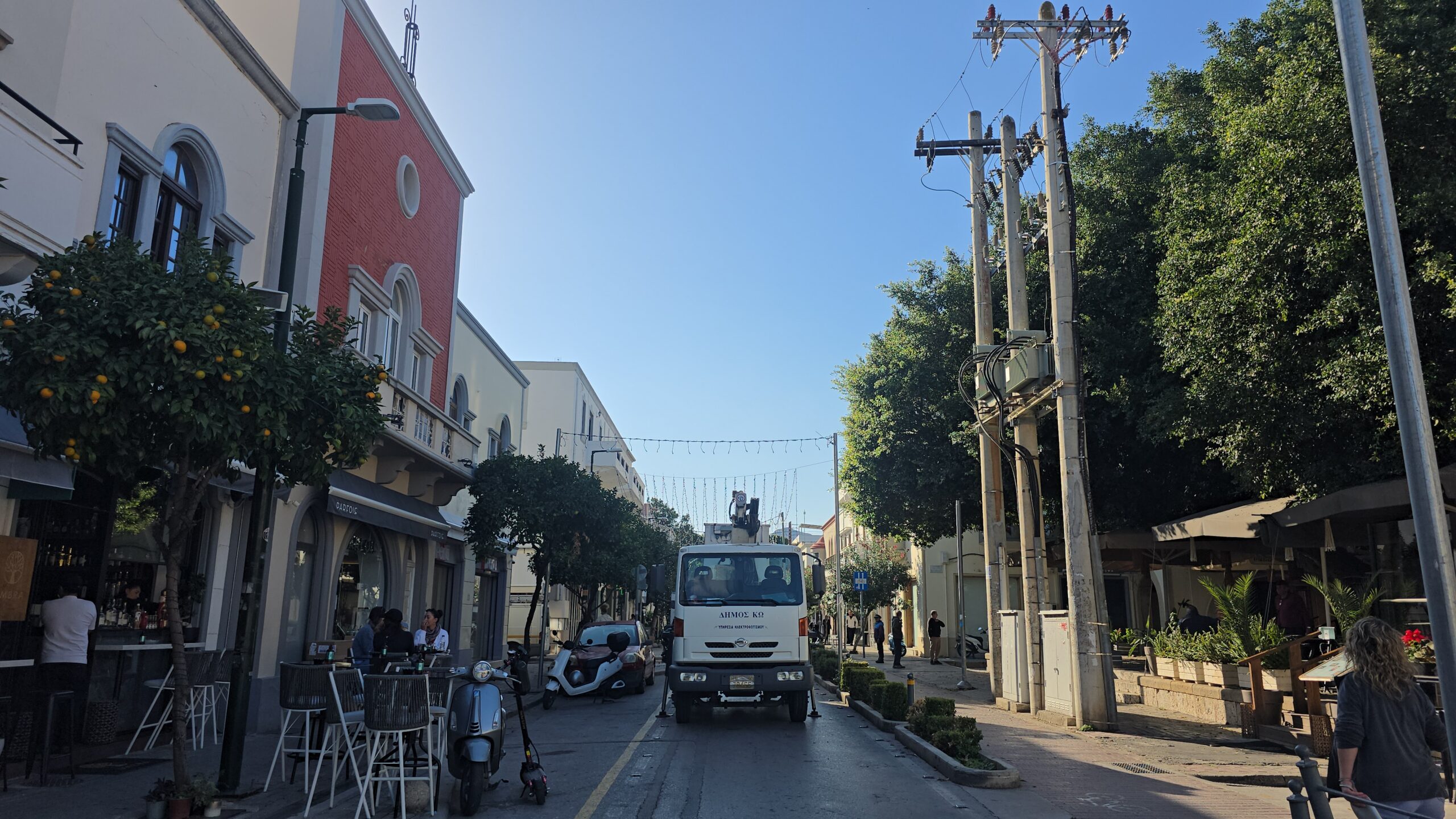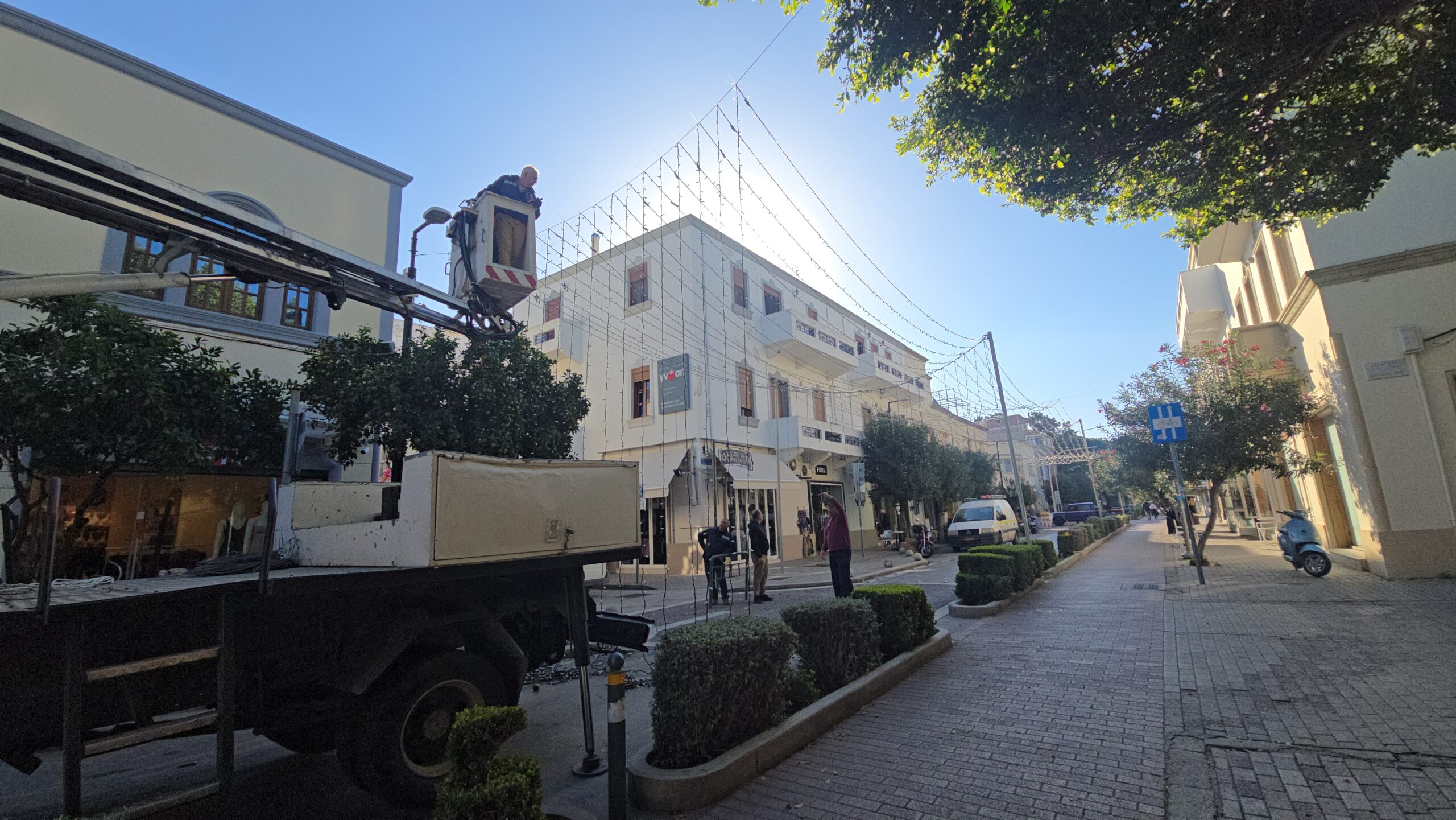 Από νωρίς το πρωί, η οδός Βασιλέως Παύλου μετατράπηκε στο επίκεντρο των εορταστικών προετοιμασιών. Το τμήμα από την Ελευθερίου Βενιζέλου και κάτω έκλεισε προσωρινά για τα οχήματα, ώστε τα συνεργεία του Δήμου Κω να ξεκινήσουν τον χριστουγεννιάτικο στολισμό.