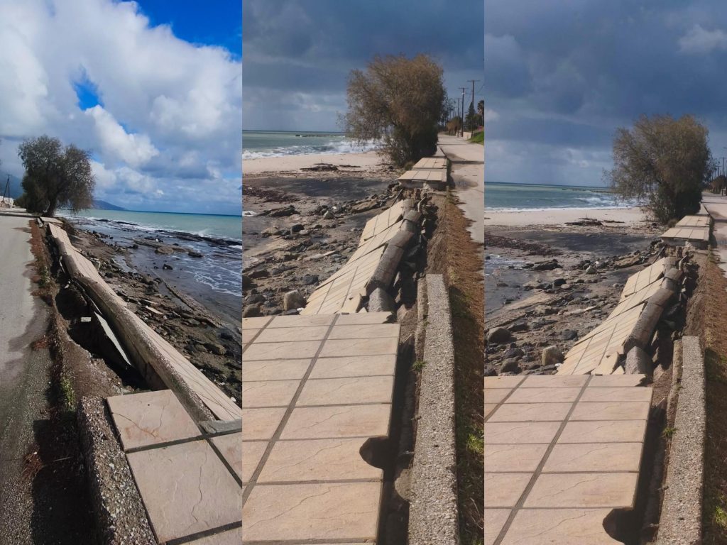 Το μεγαλύτερο πλήγμα εντοπίζεται στο δυτικό τμήμα της περιοχής, και συγκεκριμένα στο ύψος του ξενοδοχειακού συγκροτήματος «Μικρή Πόλη». Όπως αποτυπώνεται και στις φωτογραφίες, η δύναμη της θάλασσας έσπασε και «κατάπιε» κυριολεκτικά τμήματα του πεζοδρομίου και του προστατευτικού τοιχίου.