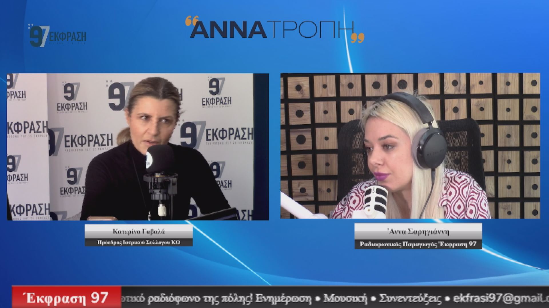 Καλεσμένη στην εκπομπή «ΑΝΝΑτροπή» με την Άννα Σαρηγιάννη στον Έκφραση 97 βρέθηκε η πρόεδρος του Ιατρικού Συλλόγου Κω και διευθύντρια της Οφθαλμολογικής Κλινικής του Νοσοκομείου Κω, Κατερίνα Γαβαλά, σε μια εφ’ όλης της ύλης συζήτηση που κινήθηκε από την επικαιρότητα και τη νησιωτικότητα έως την κατάσταση στη δημόσια υγεία και τις ελλείψεις στο Νοσοκομείο Κω.