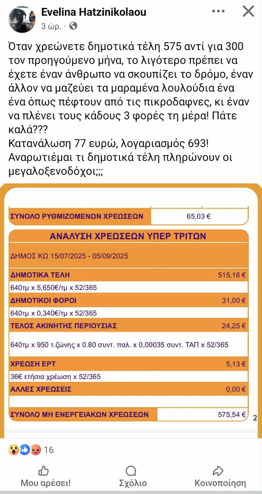 Έντονο σχολιασμό προκάλεσε ανάρτηση δημότισσας της Κω στο Facebook, μετά τον τελευταίο λογαριασμό ρεύματος που έλαβε. Παρά το γεγονός ότι η κατανάλωση ηλεκτρικού ρεύματος ήταν μόλις 77 ευρώ, ο συνολικός λογαριασμός έφτασε τα 693 ευρώ, κυρίως λόγω των δημοτικών τελών.