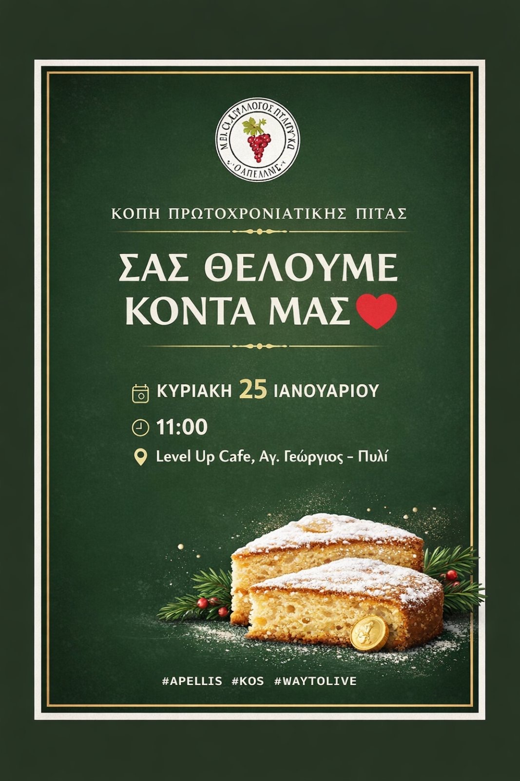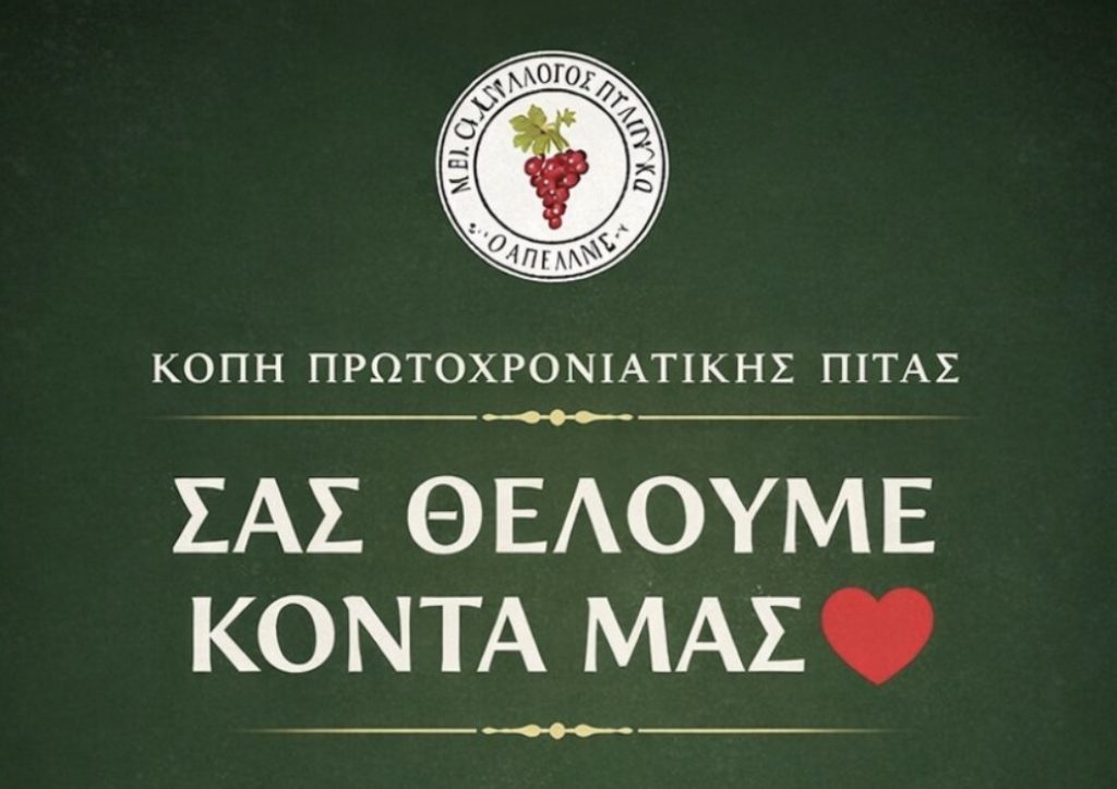 Ο Μορφωτικός Πολιτιστικός Εξωραϊστικός Σύλλογος (ΜΠΕΣ) «ΑΠΕΛΛΗΣ» υποδέχεται το 2026 με την καθιερωμένη εκδήλωση για την κοπή της βασιλόπιτας και απευθύνει ανοιχτό κάλεσμα σε όλα τα μέλη και τους φίλους του.