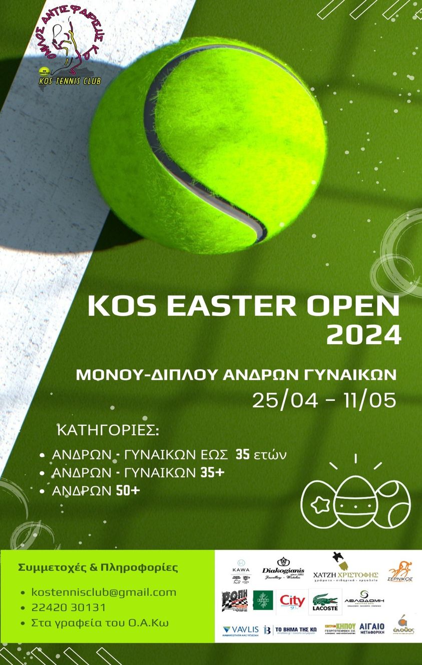 Share Facebook Twitter LinkedIn Pinterest Email Ο Ο.Α. Κω προκηρύσσει το τουρνουά ΜΟΝΟΥ και ΔΙΠΛΟΥ ΑΝΔΡΩΝ-ΓΥΝΑΙΚΩΝ “KOS EASTER OPEN 2024” και σας καλεί να δηλώσετε συμμετοχή: – τηλ.: 22420 30131 – e-mail: kostennisclub@gmail.com – στα γραφεία του, στο Πελεζίκι Κω Όμιλος Αντισφαίρισης Κω