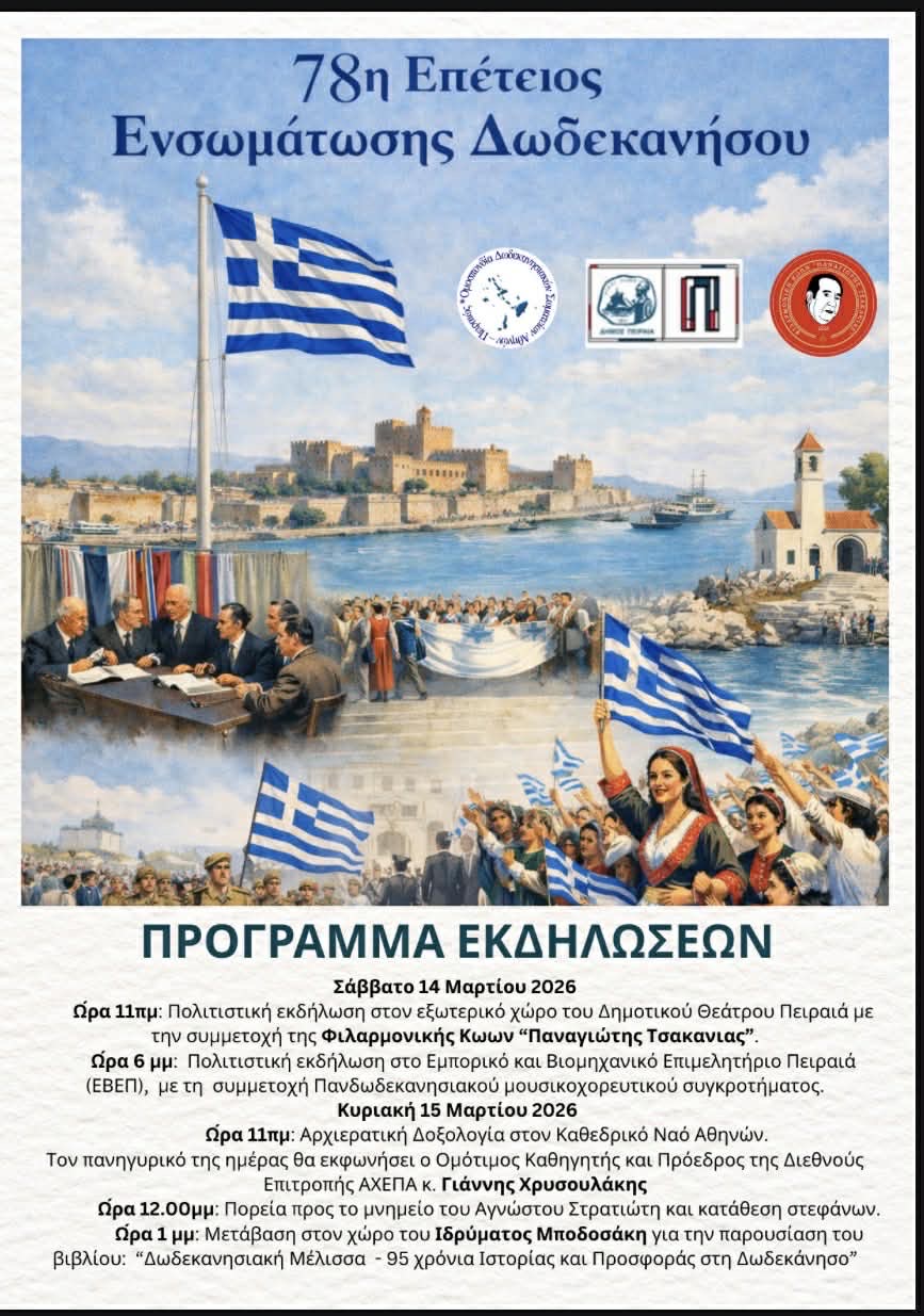 Με λαμπρότητα και τιμή ξεκίνησαν χθες Σάββατο 14 Μαρτίου οι εορταστικές εκδηλώσεις για την 78η Επέτειο της Ενσωμάτωσης της Δωδεκανήσου στον εθνικό κορμό, με επίκεντρο τον Πειραιά και την Αθήνα. Οι εκδηλώσεις, που διοργανώνονται από τη Δωδεκανησιακή Μέλισσα και την Ομοσπονδία Δωδεκανησιακών Σωματείων, προσελκύουν πλήθος κόσμου που επιθυμεί να τιμήσει την ιστορική αυτή επέτειο.