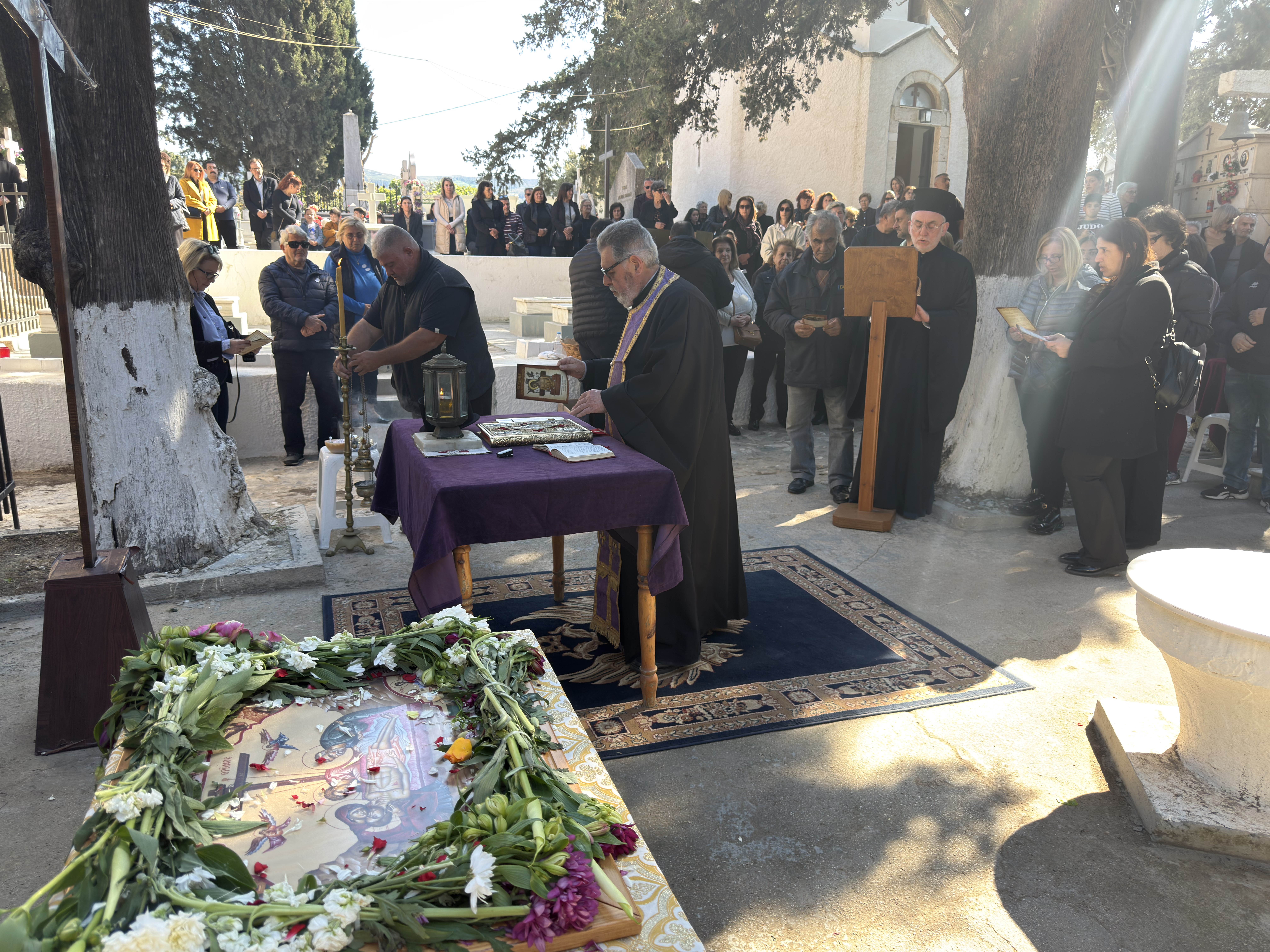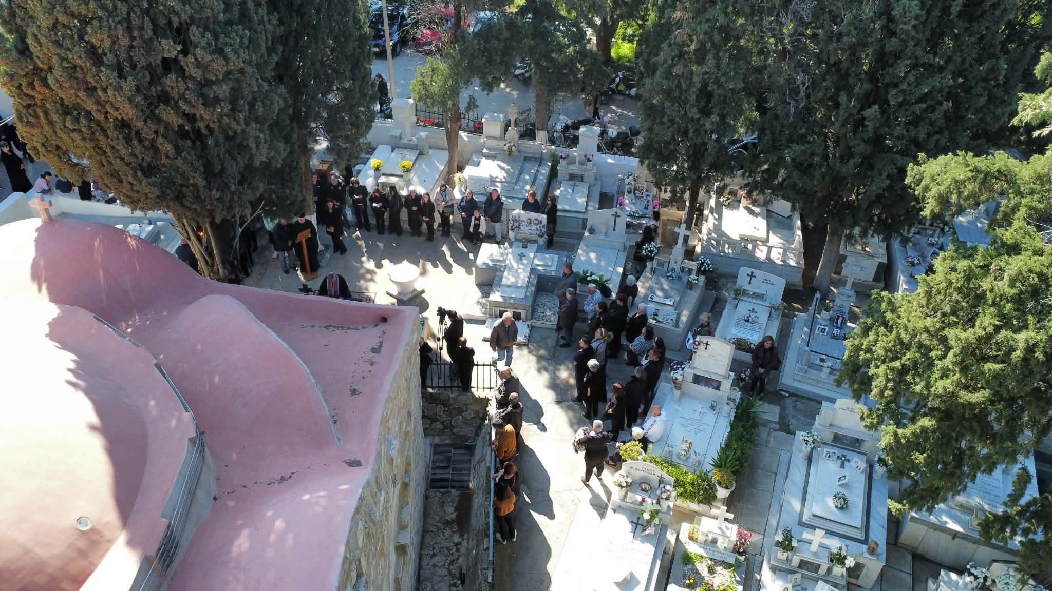 Όπως φαίνεται και στα στιγμιότυπα, ο εξωτερικός χώρος του κοιμητηρίου γέμισε από κόσμο κάθε ηλικίας. Με το Ευαγγέλιο ανοιχτό πάνω στην πορφυρή τράπεζα και τους ιερείς να ψάλλουν τα Εγκώμια, η ατμόσφαιρα ήταν φορτισμένη.