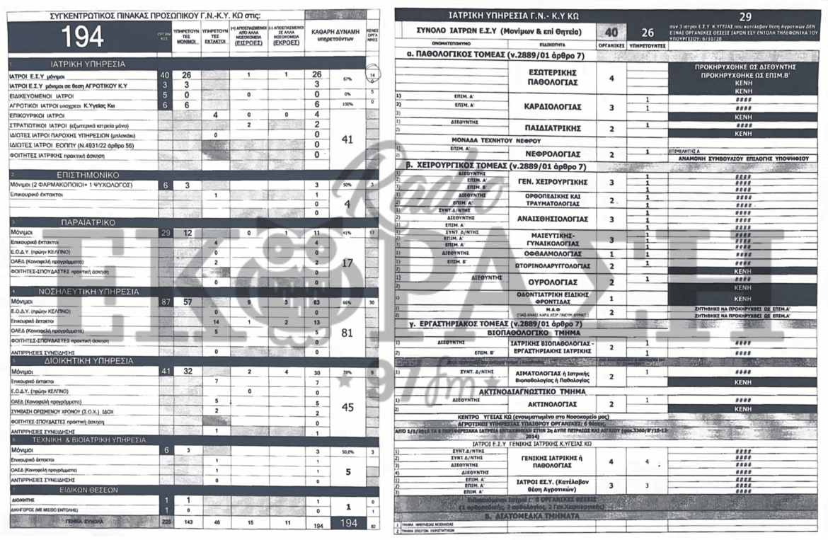 Ο Έκφραση97 FM εξασφάλισε και σας παρουσιάζει τον Συγκεντρωτικό Πίνακα Προσωπικού του Γενικού Νοσοκομείου – Κέντρου Υγείας Κω στο οποίο ως καθαρή δύναμη φαίνεται να υπηρετούν 194 εργαζόμενοι.