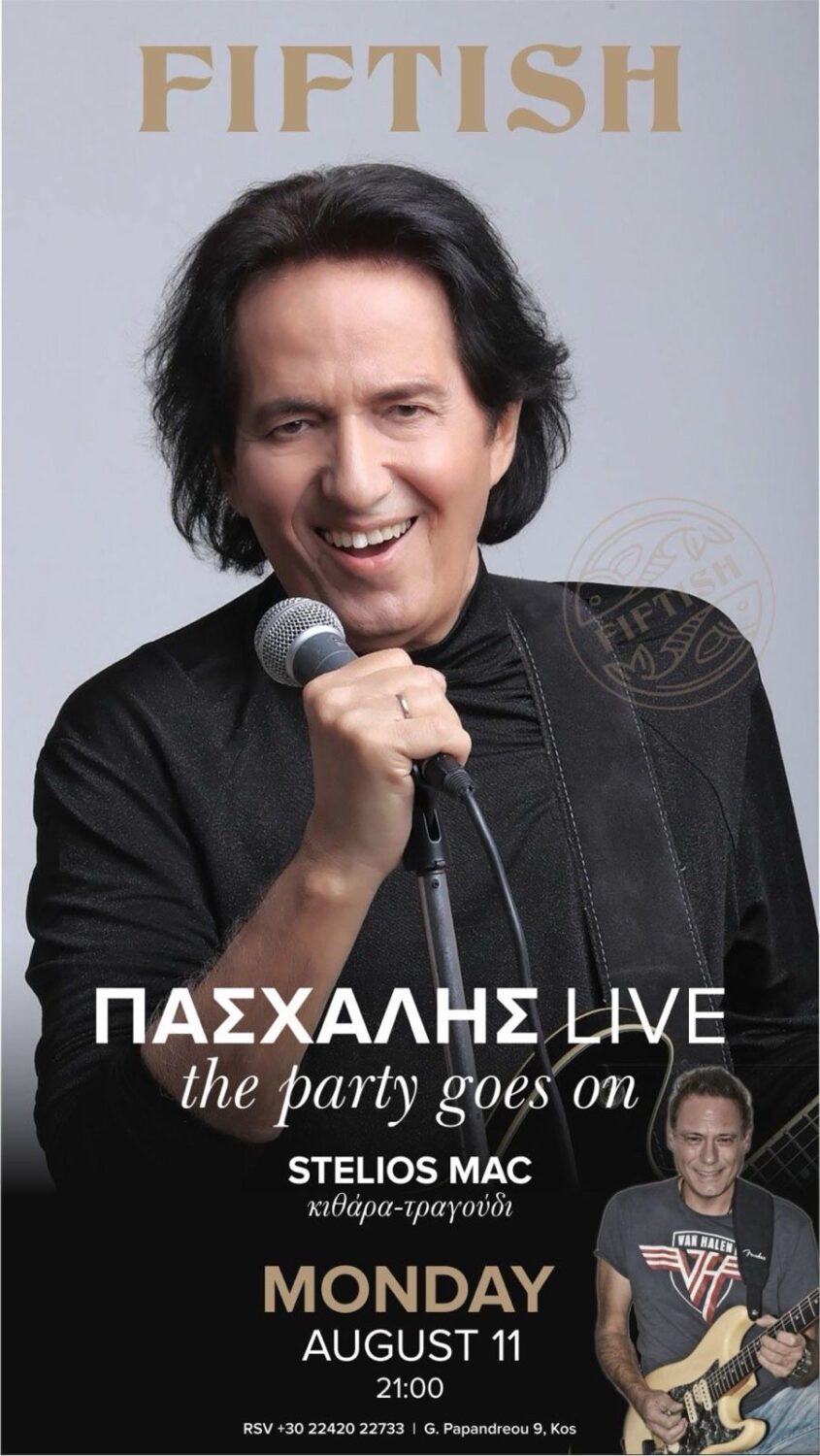 Αυτή τη Δευτέρα 11 Αυγούστου 2025, η Κως φοράει τα γιορτινά της στο Fiftish, στην οδό Γ. Παπανδρέου 9, ο αγαπημένος Πασχάλης ανεβαίνει στη σκηνή για μια μοναδική νύχτα γεμάτη νοσταλγία, κέφι και αλησμόνητες επιτυχίες. Μαζί του ο Stelios Mac στην κιθάρα, για live που θα σε ταξιδέψει σε δεκαετίες ελληνικής ποπ.