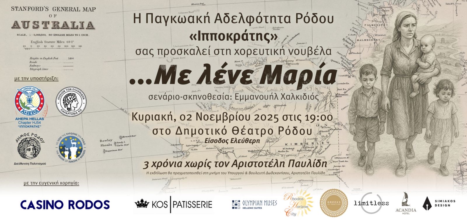 Η Παγκωακή Αδελφότητα Ρόδου «Ιπποκράτης» παρουσιάζει τη χορευτική νουβέλα, με τίτλο «Με λένε Μαρία», σε σενάριο και σκηνοθεσία Εμμανουήλ Χαλκιδίου, την Κυριακή 2 Νοεμβρίου 2025 και ώρα 19:00, στο Δημοτικό Θέατρο Ρόδου.