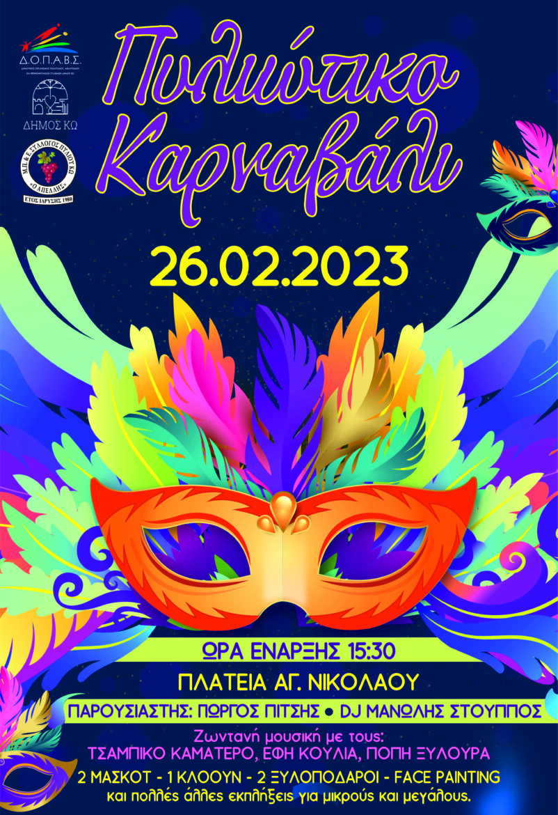Ο Πολιτιστικός Σύλλογος Πυλίου «Απελλής» σε συνεργασία με την Κοινότητα Πυλίου και τον ΔΟΠΑΒΣ διοργανώνουν το καθιερωμένο Καρναβάλι στο Πυλί την Κυριακή 26 Φεβρουαρίου στις 15:30 στην Πλατεία Αγίου Νικολάου στο Πύλι.