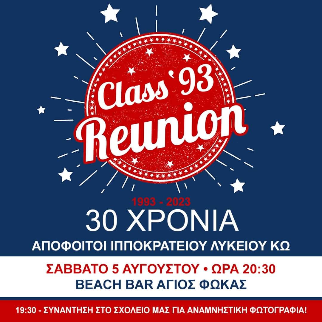 Γι’ αυτό και το γιορτάζουμε… Συμμαθητές και συμμαθήτριες του Γενικού Ιπποκρατείου Λυκείου Κω, χρονιά του 1993, ραντεβου αυτό το Σάββατο 5 Αυγούστου ώρα 19:30 έξω από το σχολείο μας.