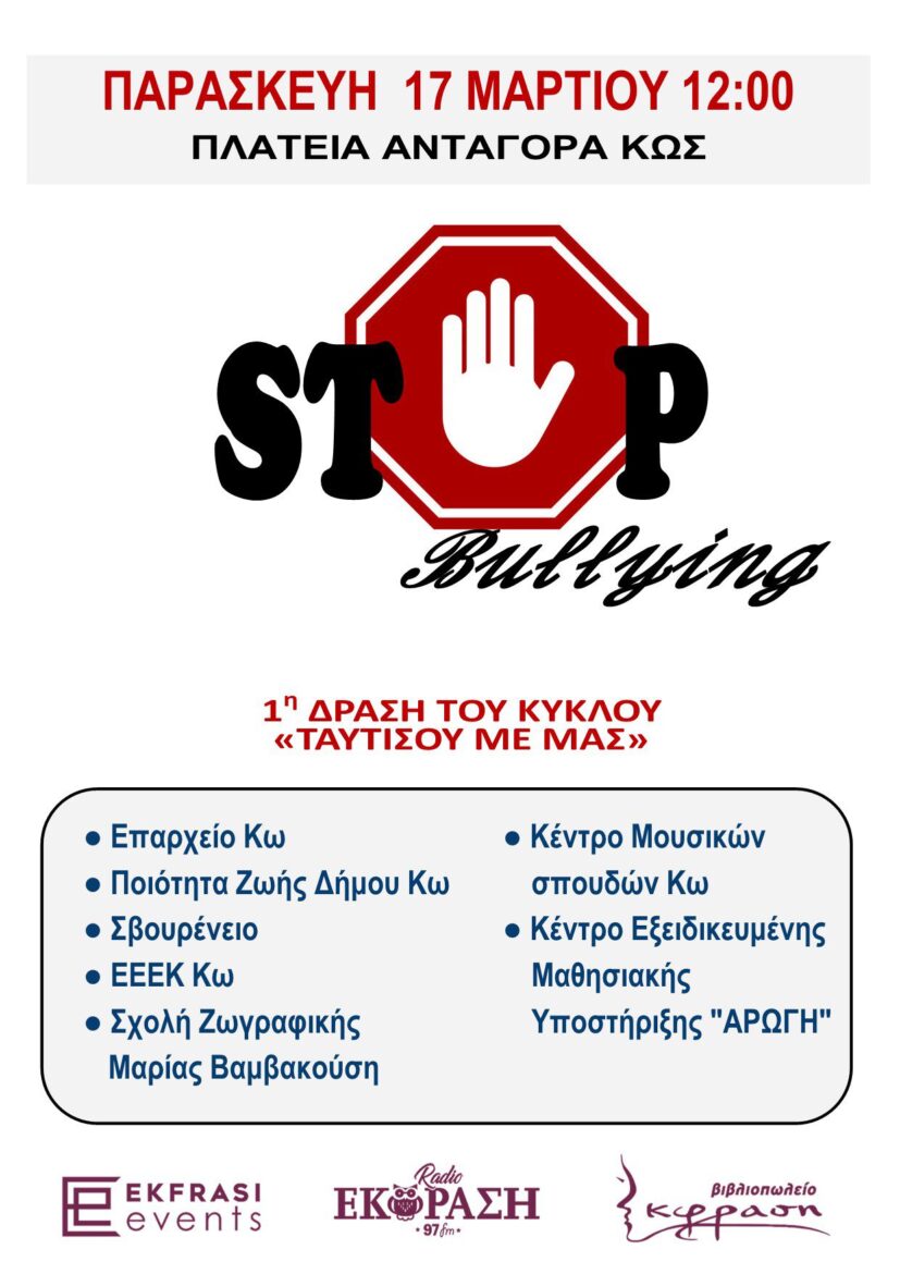 Την Παρασκευή 17 Μαρτίου 2023 και ώρα 12μμ, ο Όμιλος Έκφραση προσκαλεί στην πλατεία Ανταγόρα τα σχολεία και τους πολίτες της Κω, στην κίνηση με σκοπό την ενημέρωση και την συζήτηση μεταξύ φορέων και ειδικών, για το bullying και την εξάλειψή του.