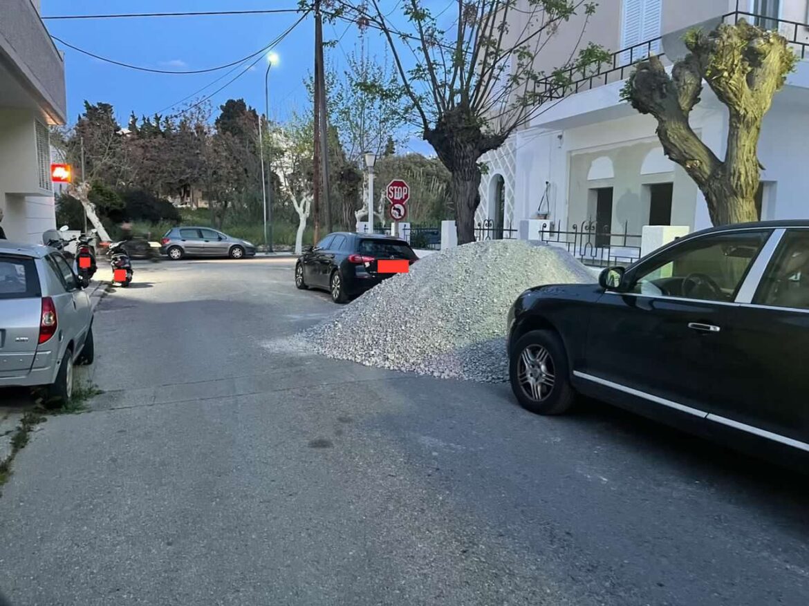 «Αυτή είναι η κατάσταση στην οδό Πίνδου, λίγα μόλις μέτρα από την Μεγάλου Αλεξάνδρου, μία από τους πιο πολυσύχναστες οδούς της πόλης της Κω. Τα οικοδομικά υλικά «βγήκαν βόλτα» στη μέση του δρόμου.