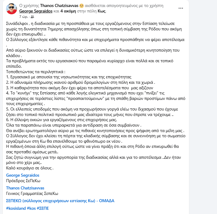 “Συνάδελφοι , η διαδικασία με τη προσπάθεια με τους εργαζόμενους στην Εστίαση τελείωσε χωρίς τη δυνατότητα 7ημερης απασχόλησης όπως στη τοπική σύμβαση της Ρόδου που ακόμη δεν έχει επικυρωθεί .. Ο Σύλλογος εξάντλησε κάθε πιθανότητα και με επιχειρήματα προσπάθησε να φέρει αποτέλεσμα . Από αύριο ξεκινούν οι διαδικασίες ούτως ώστε να επιλεγεί η δυναμικότερη κινητοποίηση του κλάδου . Τα προβλήματα εκτός του εργασιακού που παραμένει κυρίαρχο είναι πολλά και σε τοπικό επίπεδο.