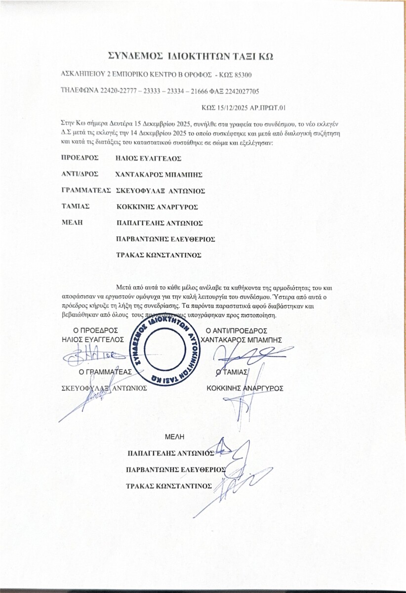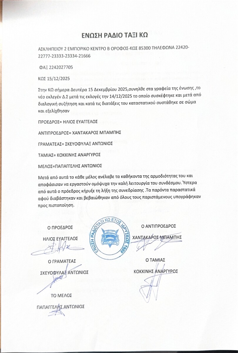 Συγκροτήθηκε σε σώμα τη Δευτέρα 15 Δεκεμβρίου 2025 το νέο Διοικητικό Συμβούλιο της Ένωσης Ραδιοταξί Κω, μετά τις εκλογές που πραγματοποιήθηκαν την Κυριακή 14 Δεκεμβρίου 2025.