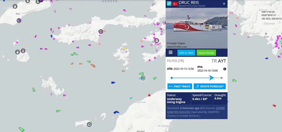 Το Oruc Reis πέρασε από Χίο, Λέσβο και αυτή τη στιγμή σύμφωνα με τον ιστότοπο Marinetraffic.com βρίσκεται μεταξύ Ρόδου και Σύμης. Κινείται με ταχύτητα 9,5 κόμβων και έχει τελικό προορισμό την Αττάλεια