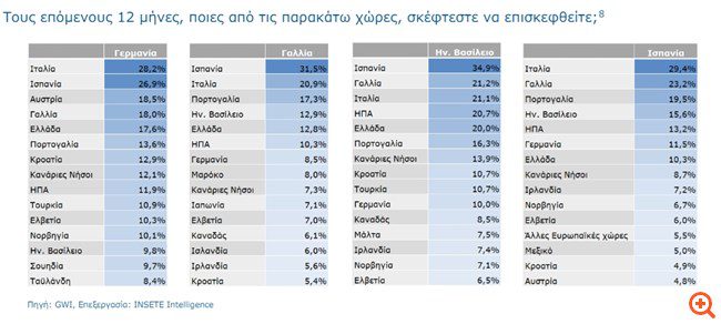 Ειδικότερα, η Ελλάδα βρίσκεται στην 5η θέση για τις αγορές της Γερμανίας, της Γαλλίας και του Ηνωμένου Βασιλείου και στην 7η θέση για την αγορά της Ισπανίας, όσον αφορά την πραγματοποίηση ταξιδιού τους επόμενους 12 μήνες. Η διαφορά ωστόσο μεταξύ της Ελλάδας και των χωρών που προηγούνται κατά μία ή δύο θέσεις είναι πολύ μικρή (της τάξεως της 1 ποσοστιαίας μονάδας ή λιγότερο) και οι χώρες αυτές είναι είτε πολύ μεγαλύτερες (π.χ. Γαλλία ή Ηνωμένο Βασίλειο) είτε πολύ πιο εύκολα προσβάσιμες ακόμα και οδικώς (π.χ. η Αυστρία από τη Γερμανία).