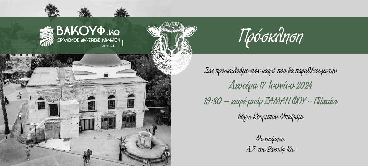 Share Facebook Twitter LinkedIn Pinterest Email Σας προσκαλούμε στον καφέ που θα παραθέσουμε, την Δευτέρα 17 Ιουνίου 2024 και ώρα 19:30 μ.μ. – καφέ μπαρ ”ZAMAN FOU” στο Πλατάνι, λόγω Κουρμπάν Μπαϊράμι. Θα χαρούμε πολύ να μας τιμήσετε με την παρουσία σας! ΒΑΚΟΥΦ Κω
